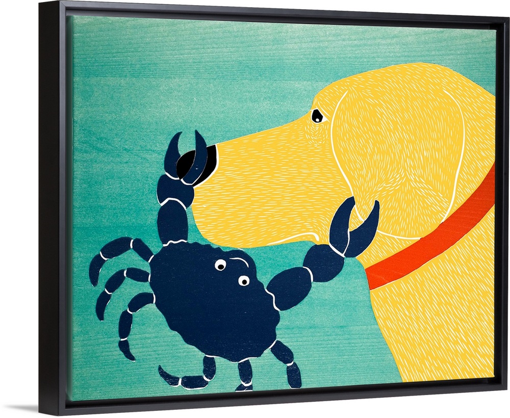 <p>Illustration of a yellow lab with a blue crab pinching its nose and ear.</p>