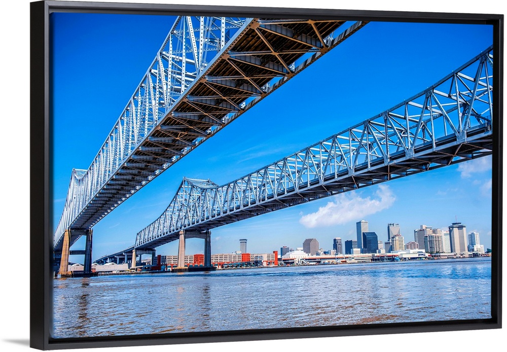 <p>Photograph of the Crescent City Connection, formerly the Greater New Orleans Bridge, twin cantilever bridges that carry U.S. Highway 90 Business over the Mississippi River in New Orleans, Louisiana, with the New Orleans skyline in the distance.</p>