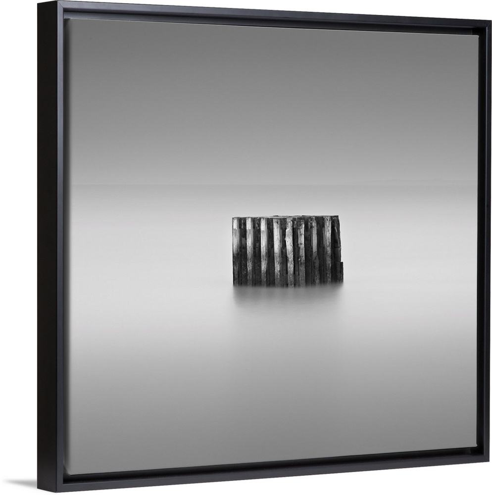 <p>A zen minimalist calm monochrome black and white seascape with flat water and a cloudless sky showing a square harbour installation.</p>