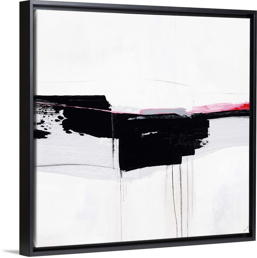 <p>Contemporary abstract painting using bold black swipes with hints of pink against a white surface.</p>