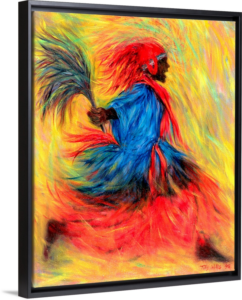 <p>Huge contemporary art showcases an African-American in a vibrantly colored costume performing a dance while holding feathers.</p>