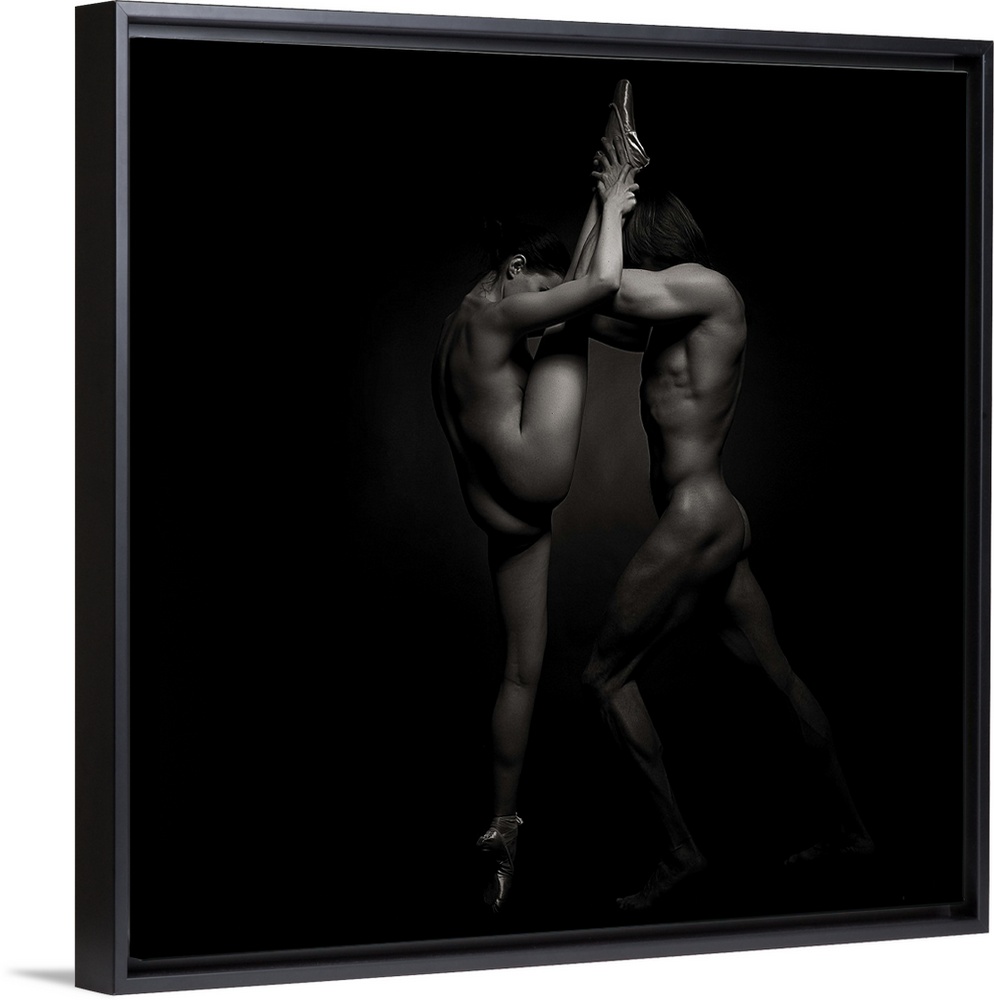 <p>Black and white square photograph of a male and female dancer posing together in low key lighting.</p>
