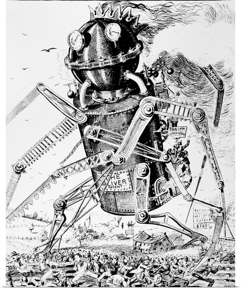 <p>Undated political cartoon showing the Oliver Patent - Monopoly in Crucible Steel - as a giant steam driven robot rampaging through a scattering crowd of people, with the Tariff Commission riding on its back. A building labeled Implement Factory and a sign, No crucible steel can be landed off this boat in the background.</p>