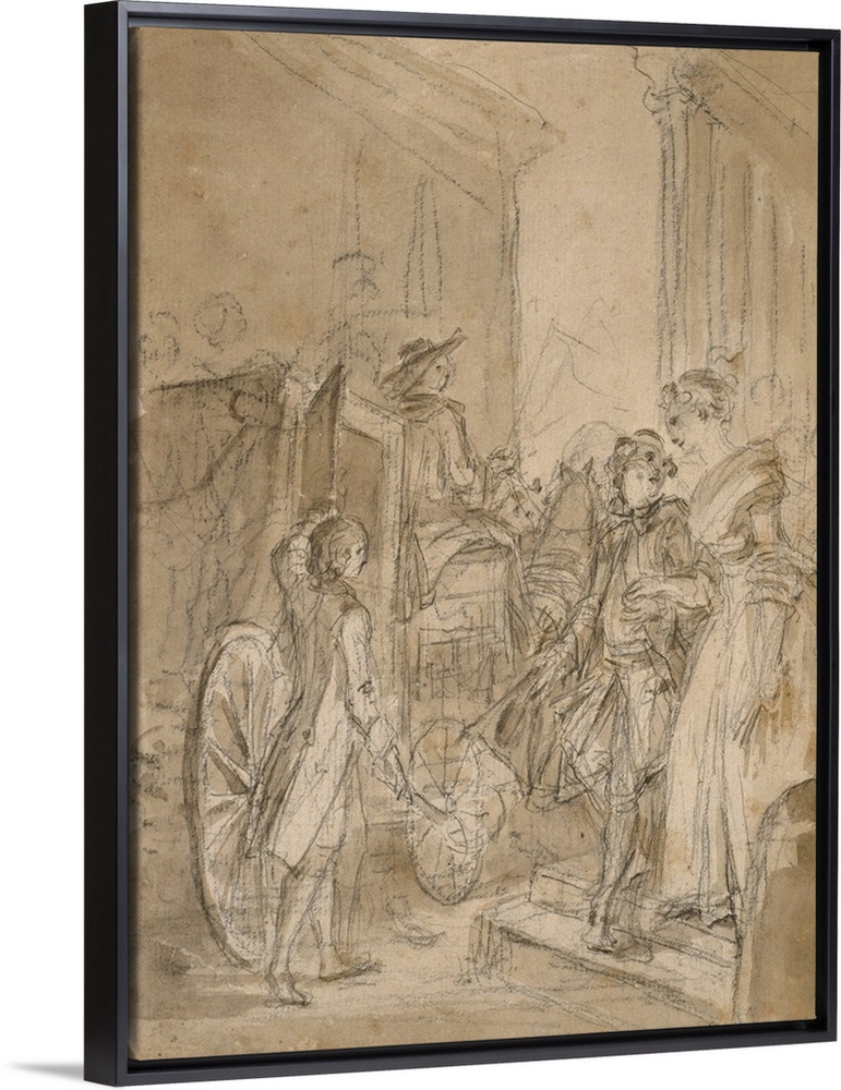 <p>The Departure by Coach, c.1780-89, black chalk, and brush and brown wash, with touches of gray wash, on cream laid paper, laid down on cream laid card.</p>
