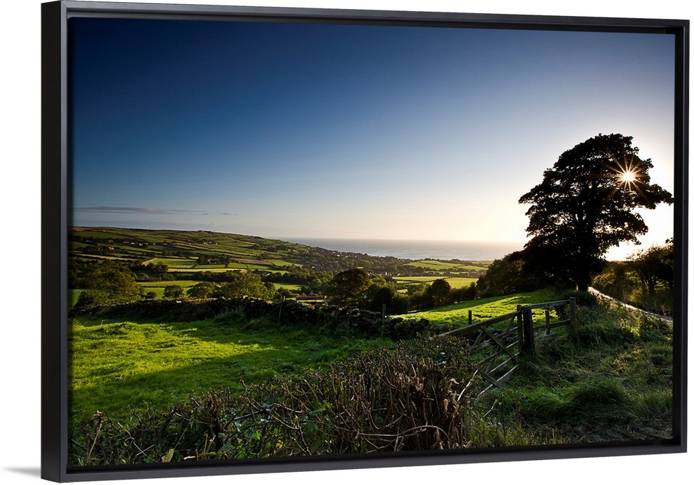 <p>A spring landscape of green fields and trees with a blue sky looking down to the coast in North Yorkshire, England, UK.</p>