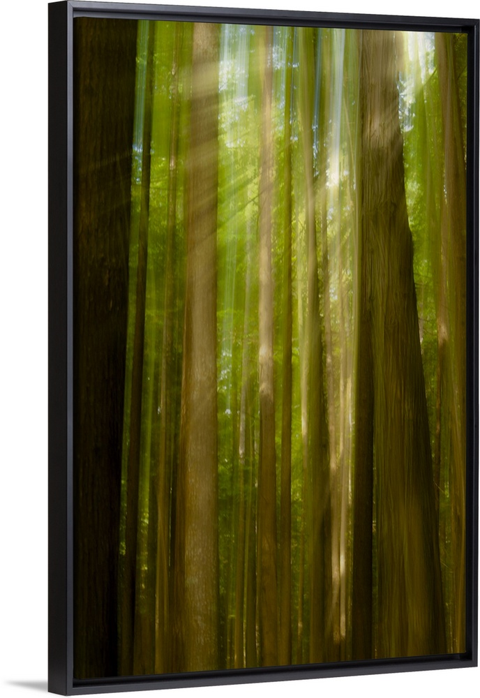 <p>The diffuse sunrays stream through tall trees in a green forest.</p>