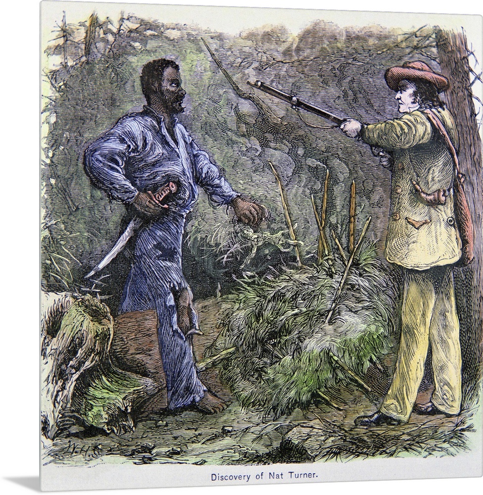 <p>'The Discovery of Nat Turner\' (1800-31) (colour litho) by American School, (19th century); Private Collection; (add.info.: slave who led a large but unsuccessful rebellion in Southampton County, Virginia, 1831;)</p>