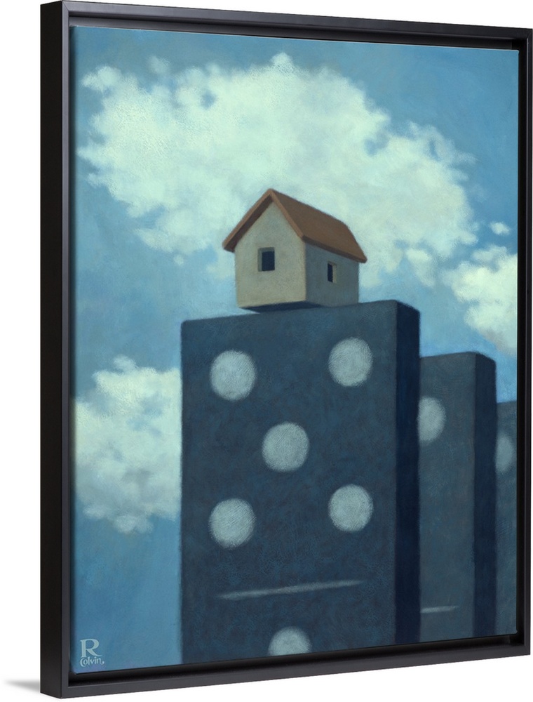 <p>Conceptual painting of large dominoes with a house on top.</p>