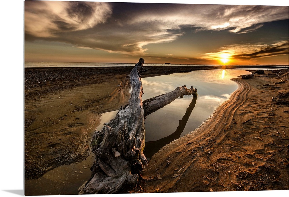 <p>Piece of driftwood laying on the shore at sunset, Greece.</p>