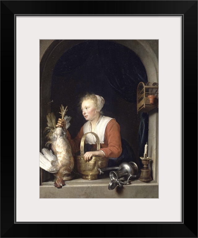 <p>XIR34882 The Dutch Housewife or, The Woman Hanging a Cockerel in the Window, 1650 (oil on panel) by Dou, Gerrit or Gerard (1613-75); 26.5x20.5 cm; Louvre, Paris, France; (add. info.: Femme accrochant un coq a sa fenetre dit aussi La Menagere ou La Cuisiniere Hollandaise); Giraudon; Dutch, out of copyright</p>