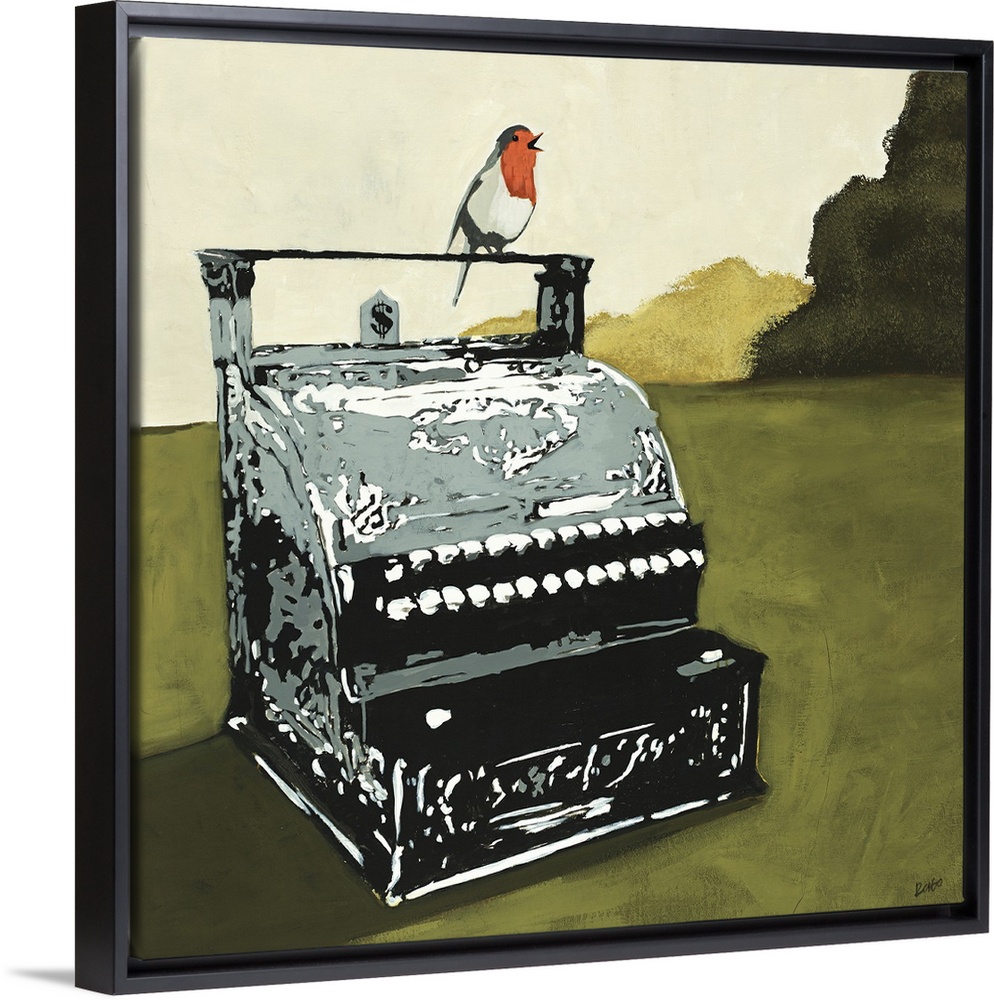 <p>Contemporary painting of a red and white bird perched on top of a vintage cash register that sits in an open, green field. Large bushes and a clear sky sit above the horizon.</p>