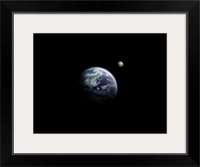 <p>The earth and the moon, computer graphic, black background, copy space</p>