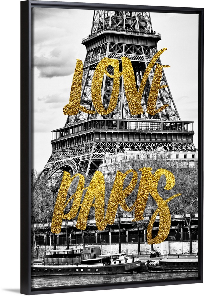 <p>Black and white photograph of part of the Eiffel Tower and the river with boats with the phrase "Love Paris" written on top in gold glitter. From the Paris Fashion Series.</p>