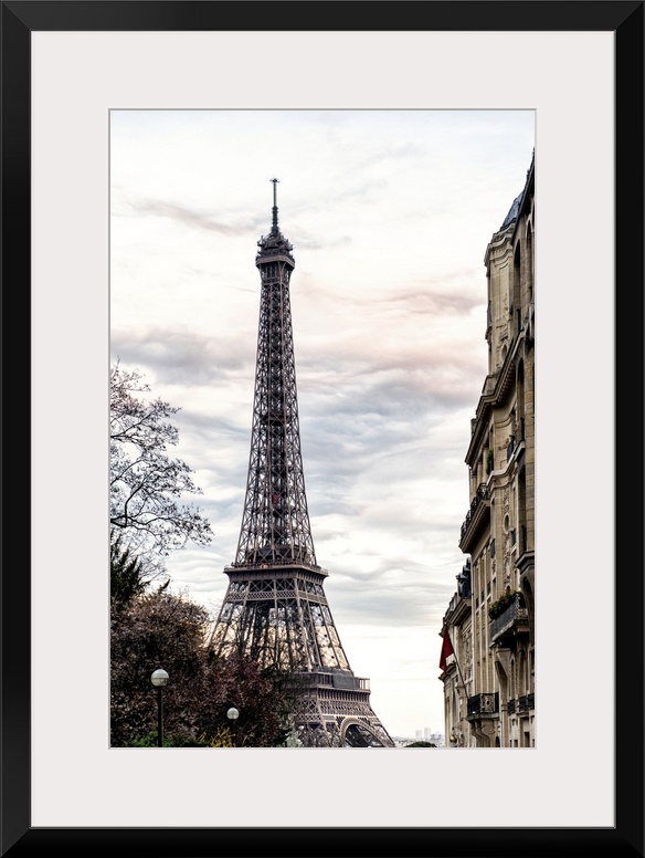 <p>View of the famous Eiffel Tower monument in Paris, France, against an overcast sky.</p>