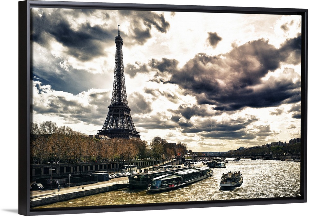 <p>Fine art photo of the Eiffel Tower on the edge of the Seine River with dramatic clouds.</p>