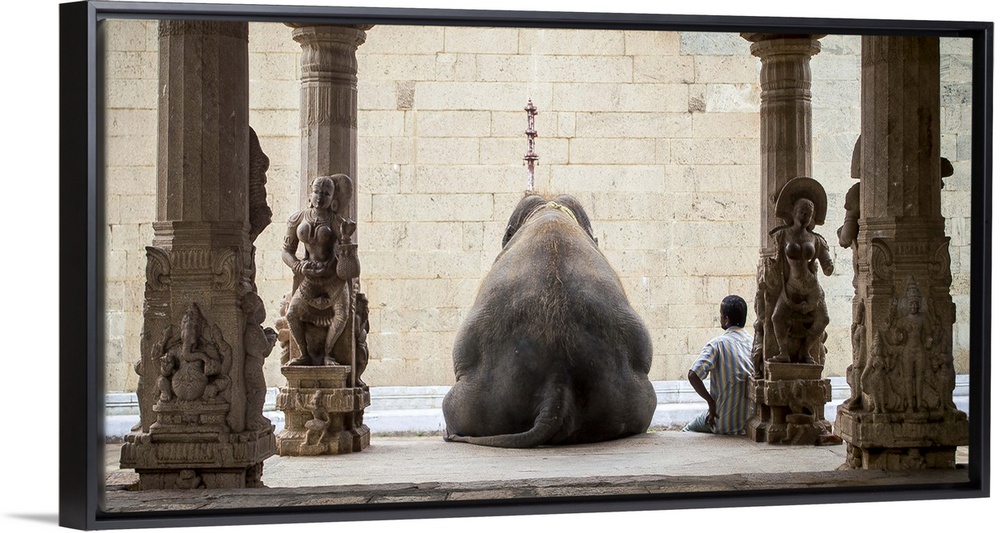 <p>An elephant and a man sit side by side in a temple in India.</p>