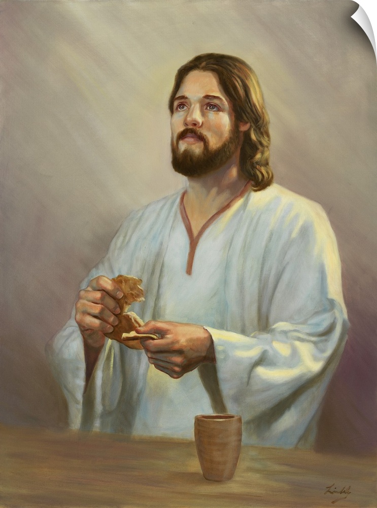 <p>Jesus holding bread.</p>