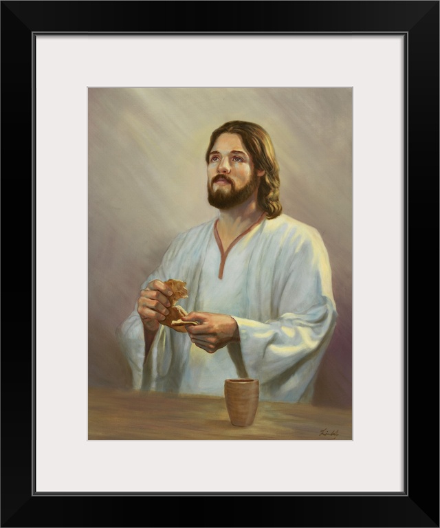 <p>Jesus holding bread.</p>