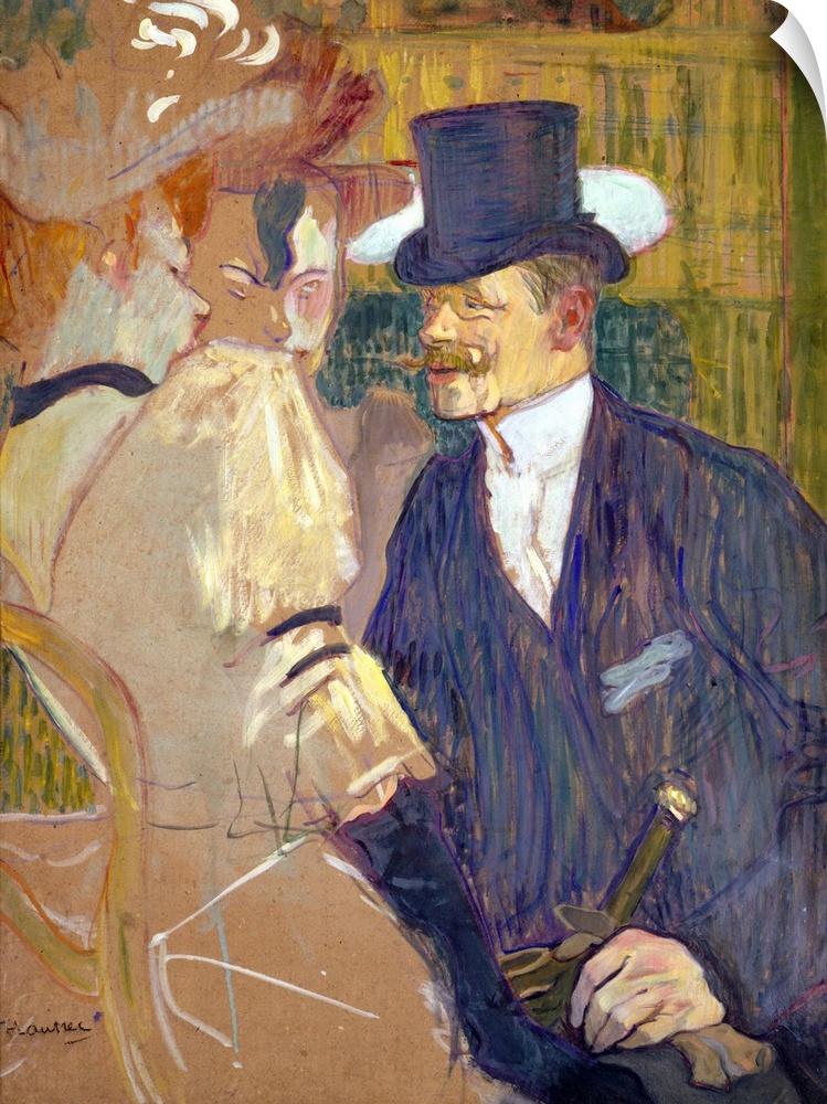 <p>William Tom Warrener, an English painter and friend of Lautrec's, appears as a top-hatted gentleman chatting up two female companions at the Moulin Rouge, the dance hall that epitomized the colorful and tawdry nightlife of fin-de-siecle Paris. The women's suggestive attitudes-and Warrener's ear, reddened in embarrassment-indicate the risque nature of their conversation. This painting served as a preparatory study for a color lithograph of 1892.</p>