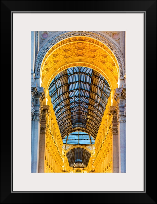 <p>Milan, Lombardy, Italy. The entrance to the Galleria Vittorio Emanuele II illuminated at dusk.</p>
