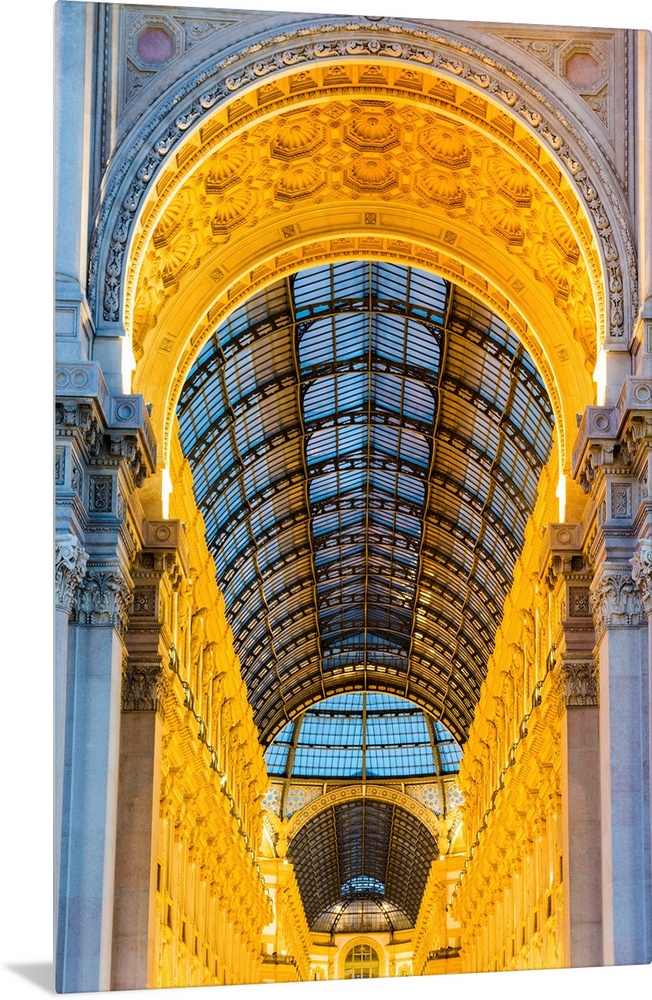 <p>Milan, Lombardy, Italy. The entrance to the Galleria Vittorio Emanuele II illuminated at dusk.</p>