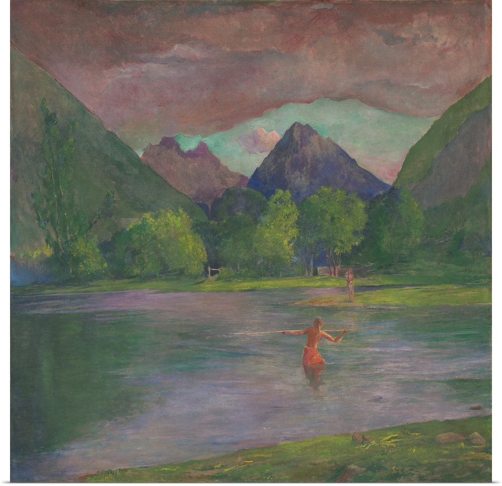 <p>The Entrance to the Tautira River, Tahiti. Fisherman Spearing a Fish, by John La Farge, 1895, American painting, oil on canvas. La Farge, with Henry Adams, traveled the South Seas in 1890 and 1891, spending time and absorbing the culture of Tahiti. This i</p>