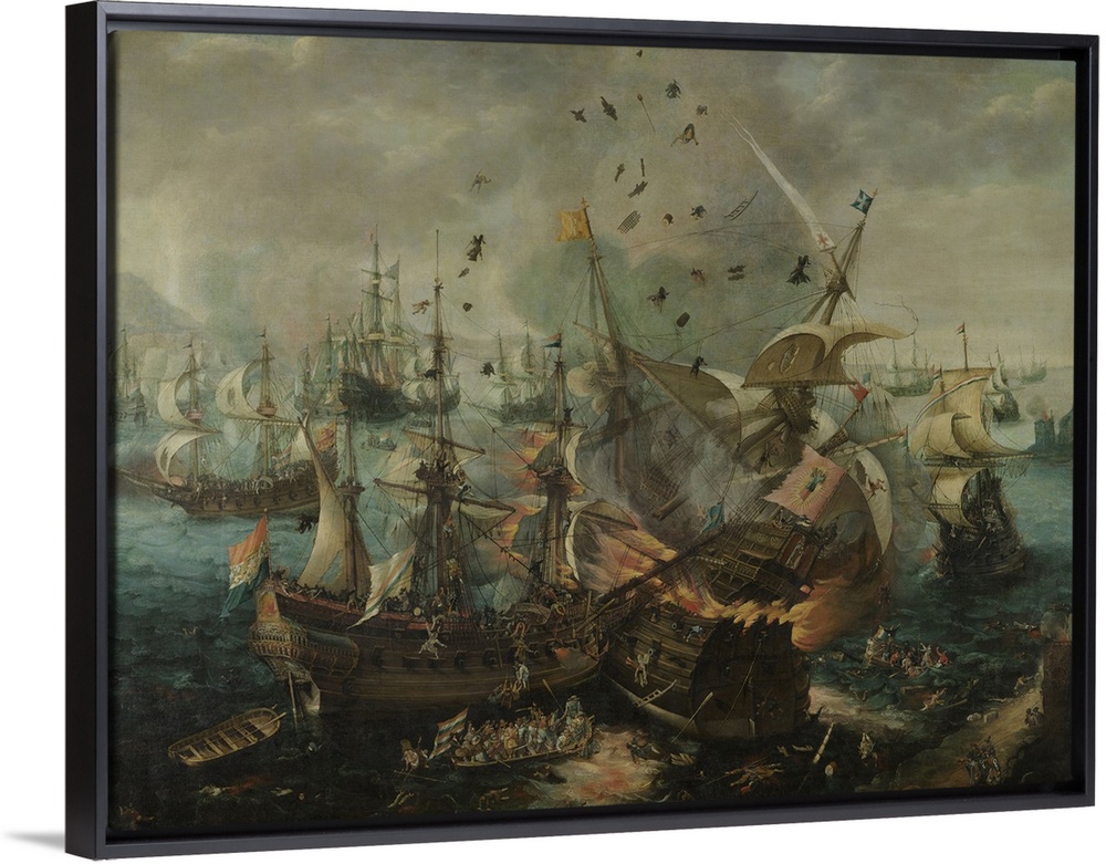<p>The Explosion of the Spanish Flagship during the Battle of Gibraltar, by Cornelis Van Wieringen, 1621, Dutch painting, oil on canvas. On April 25, 1607. Dutch ships took the Spanish fleet by surprise, winning the first major Dutch victory at sea</p>