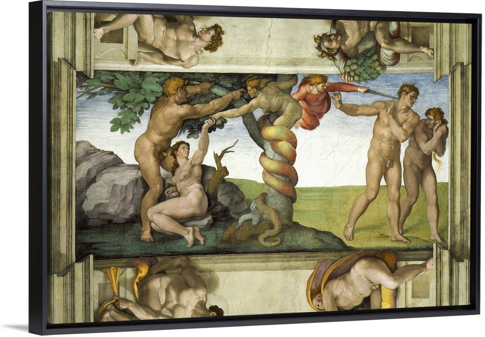 <p>Sistine Chapel Ceiling: The Fall of Man and the Expulsion from the Garden of Eden, with four Ignudi, 1510, fresco, post-restoration. By Michelangelo Buonarroti (1475-1564).</p>