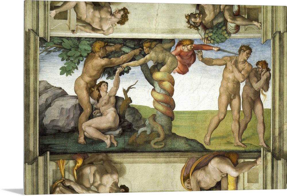 <p>Sistine Chapel Ceiling: The Fall of Man and the Expulsion from the Garden of Eden, with four Ignudi, 1510, fresco, post-restoration. By Michelangelo Buonarroti (1475-1564).</p>
