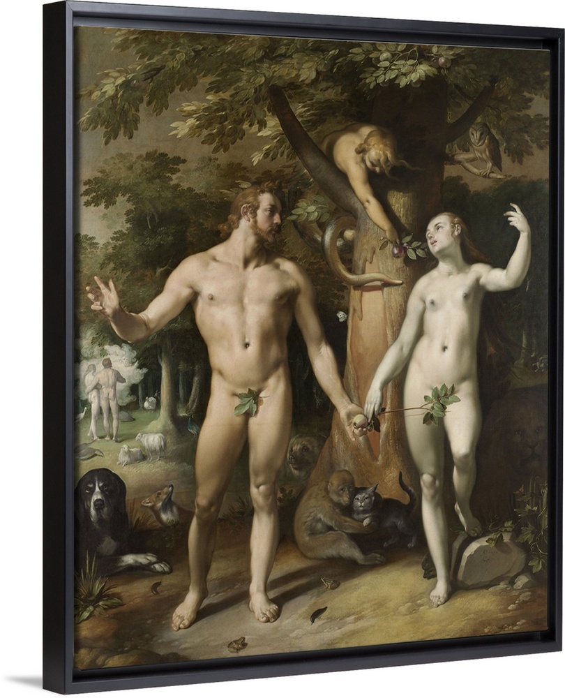 <p>The Fall of Man, by Cornelis van Haarlem, 1592, Dutch painting, oil on canvas. In the left background, God, as a cloud with a human face and hands, forbids Adam and Even to eat from the tree of the knowledge of good and evil. In foreground, tempted by t</p>
