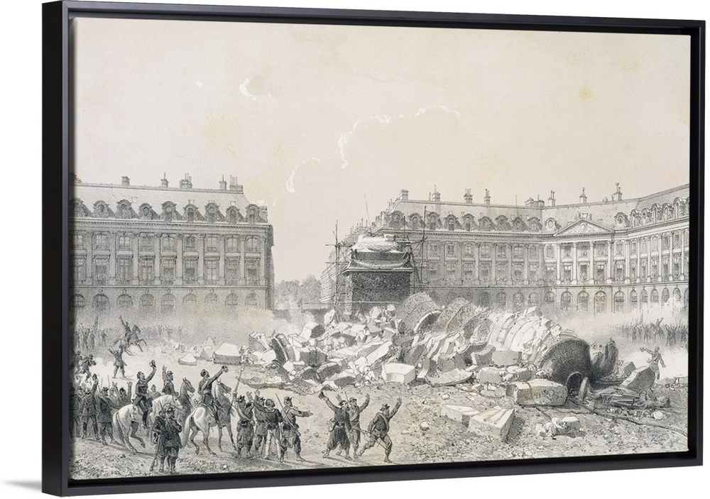 <p>La Chute de la colonne Vendome; Commune of Paris, insurrection of Paris from 18th March to 28th May 1871; Communards led by Gustave Courbet tore down the column; during 1873-74 the column was reestablished; column in the style of Trajan's Column in Rome, built in 1806-10, stone core encased in the bronze of 1250 cannons captured at the Battle of Austerlitz;</p>