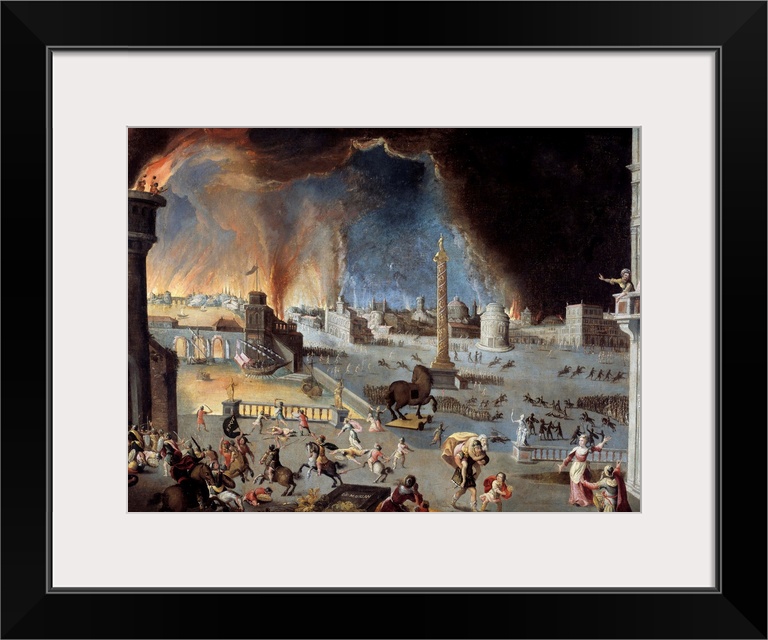 <p>The fall of Trojan - Scene of the Trojan War : the city was devastated by the Greeks entered the city thanks to the horse. Painting by Jean Maublanc (1582-1628). 17th century. Beaux-Arts museum, Besancon, France</p>