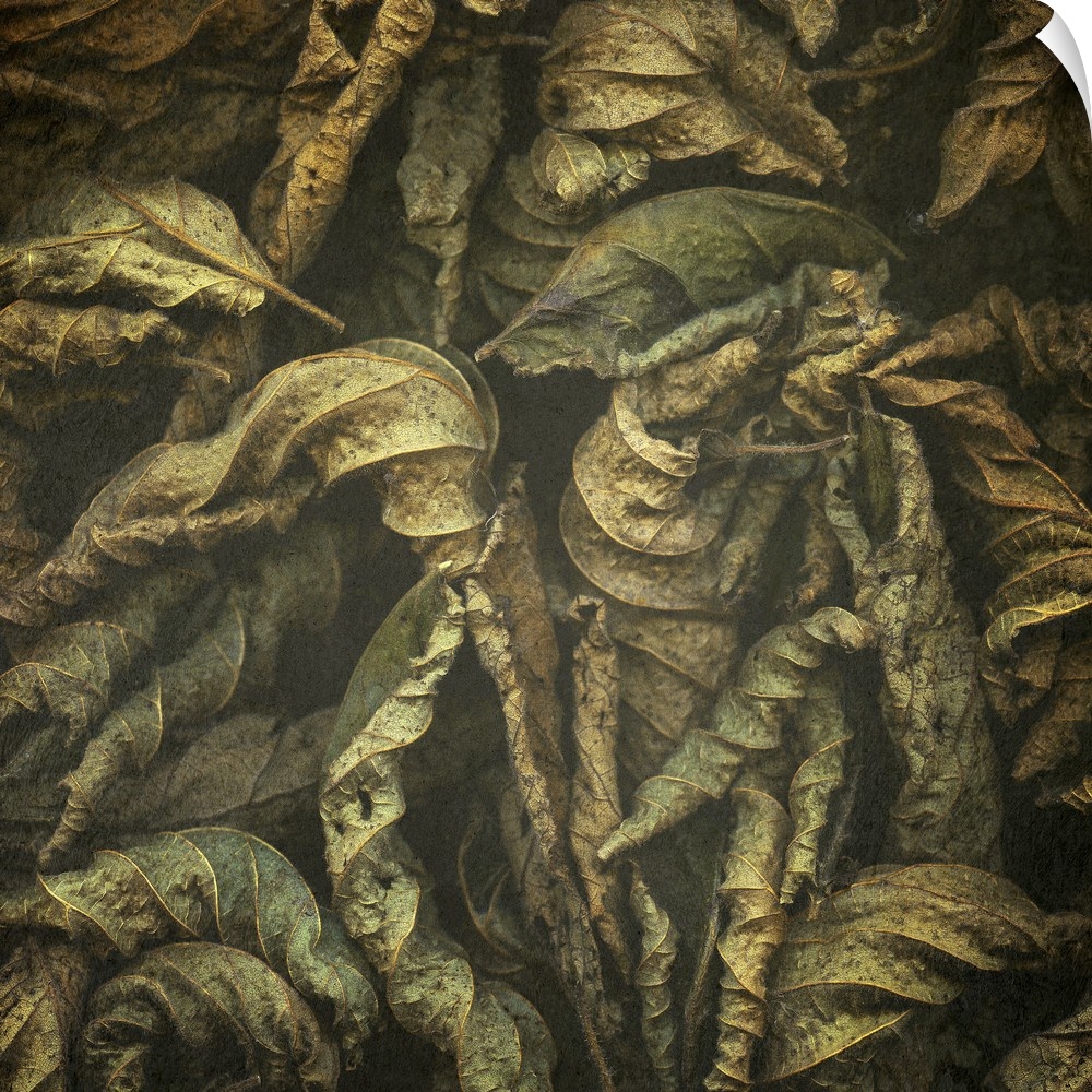 <p>Several fallen leaves curled up on the ground.</p>