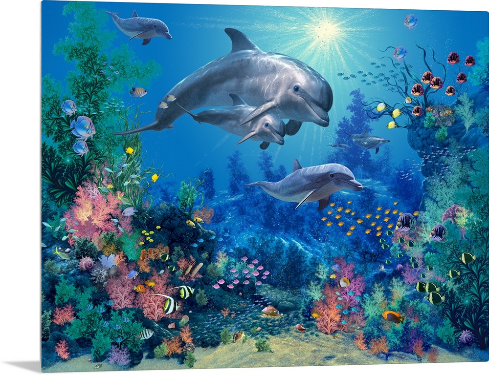 <p>Artwork created of the ocean wildlife with a family of dolphins and different species of fish swimming all around. Colorful coral lines the bottom and sides of the print.</p>