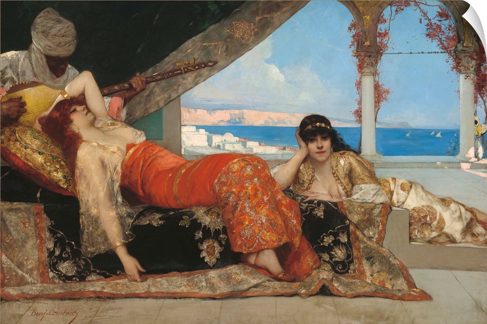 <p>The Favorite of the Emir, by Jean Joseph Benjamin Constant, French painting, oil on canvas. An Orientalist fantasy of two concubines in a harem, has Mediterranean seaside landscape in the background. The luxuriously dressed, languid, women are serenaded b</p>