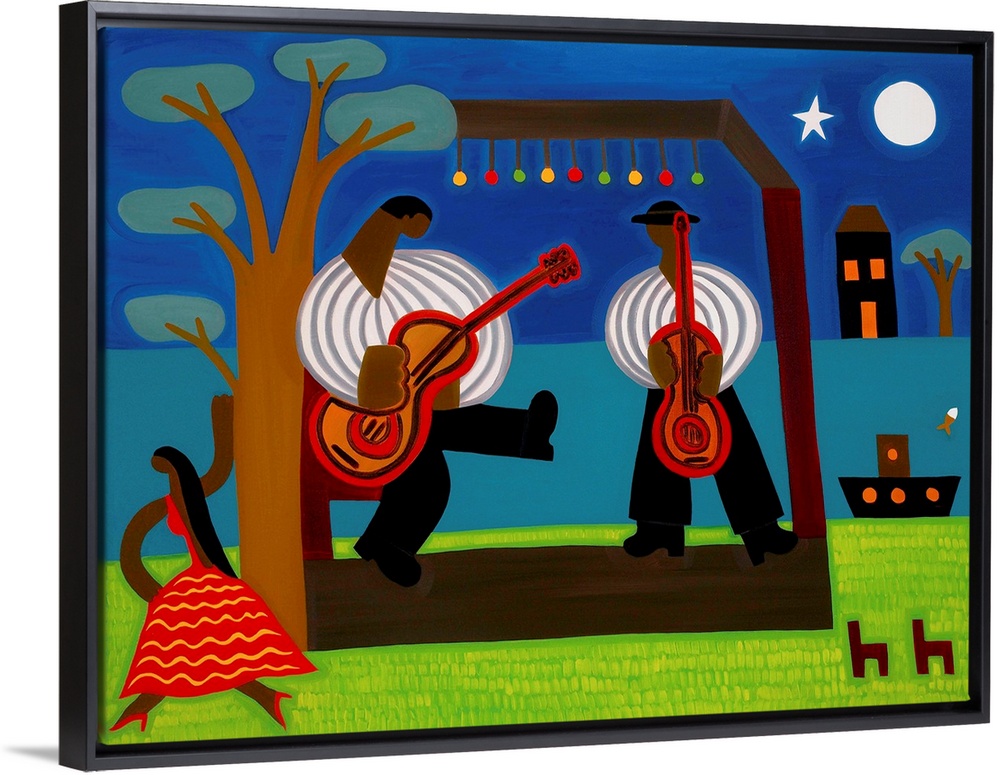 <p>Contemporary painting of two guitar players performing on a stage.</p>
