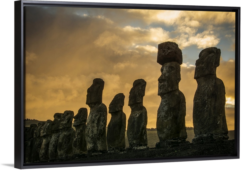 <p>The fifteen moais of Tongariki close-up in decreasing perspective against a colourful sunrise; Easter Island, Chile</p>