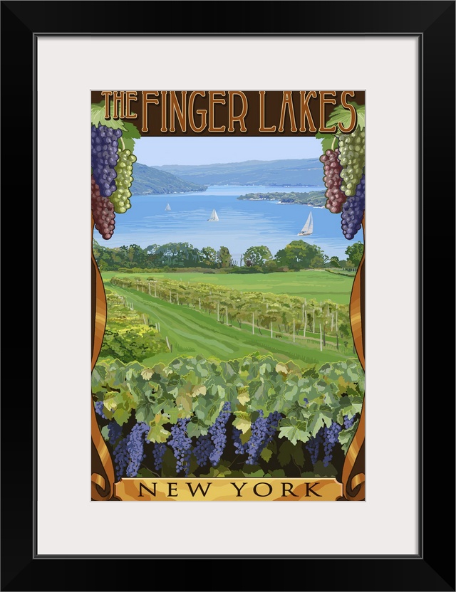 <p>Retro stylized art poster of a lush vineyard, with purple grapes.</p>