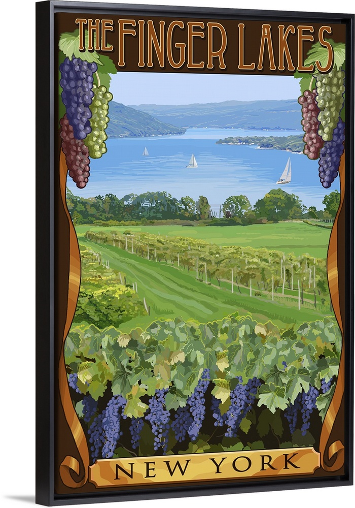 <p>Retro stylized art poster of a lush vineyard, with purple grapes.</p>