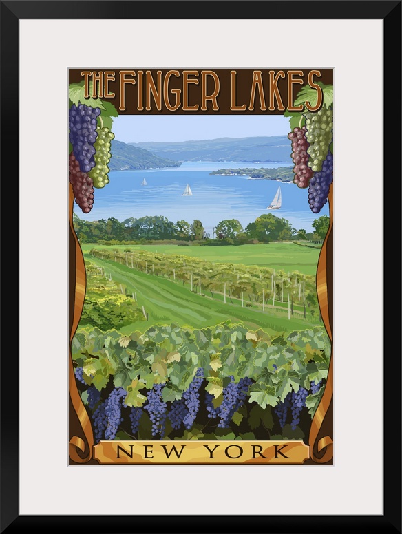 <p>Retro stylized art poster of a lush vineyard, with purple grapes.</p>