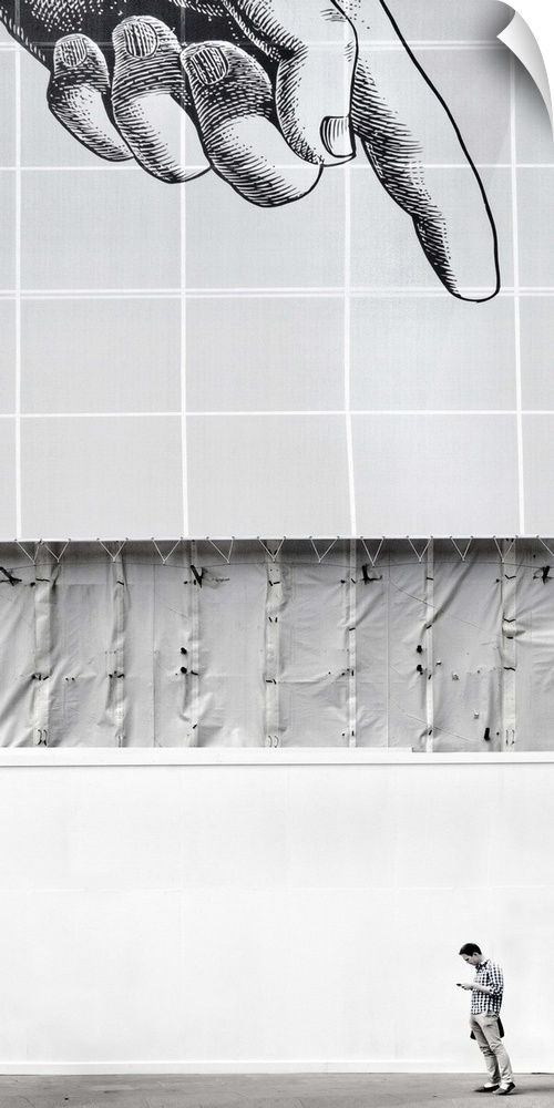 <p>A man stands on the street below a mural of a giant hand, which appears to be pointing at him.</p>