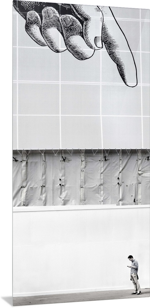 <p>A man stands on the street below a mural of a giant hand, which appears to be pointing at him.</p>