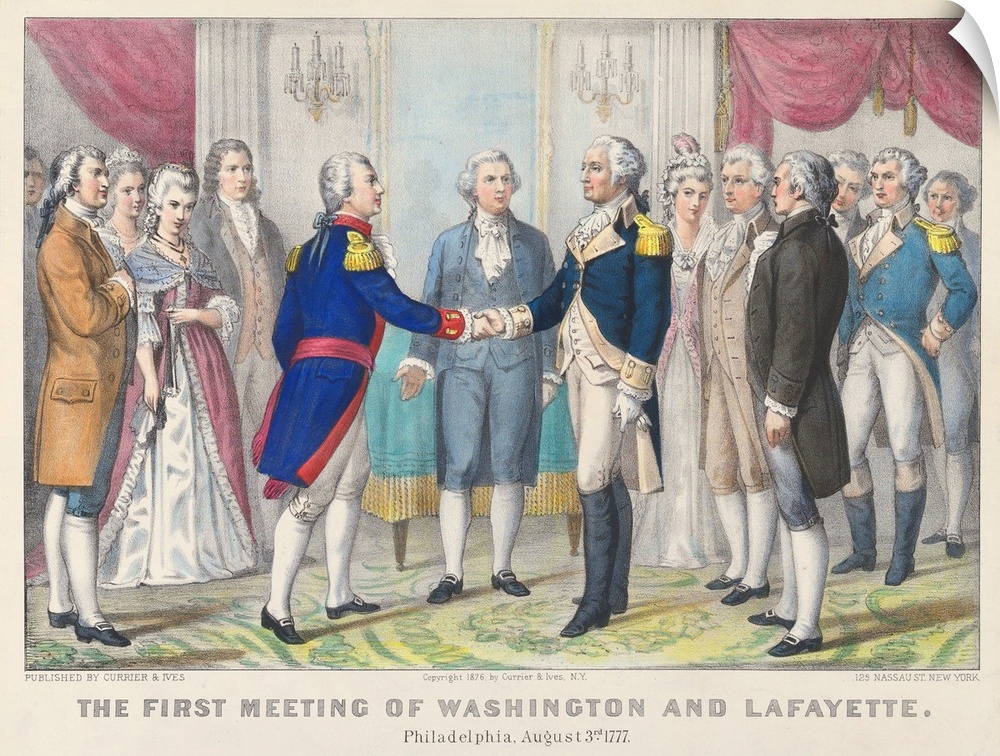 <p>The First Meeting of Washington and Lafayette in Philadelphia, August 3rd 1777, 1876 (originally hand-coloured lithograph) by Currier, N. (1813-88) and Ives, J.M. (1824-95)</p>