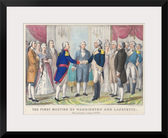 <p>The First Meeting of Washington and Lafayette in Philadelphia, August 3rd 1777, 1876 (originally hand-coloured lithograph) by Currier, N. (1813-88) and Ives, J.M. (1824-95)</p>