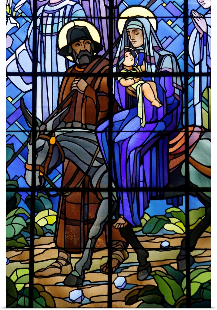 <p>Stained glass window of the Flight into Egypt, in Chedde church, Haute Savoie, France, Europe.</p>