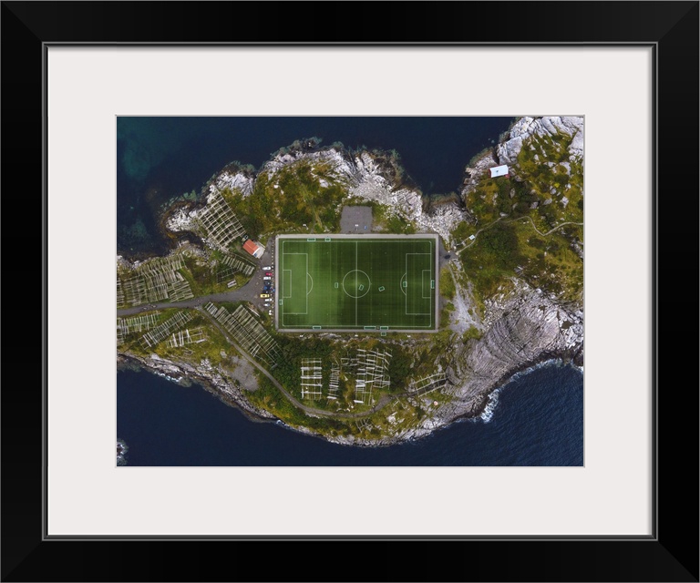 <p>The football field of Henningsvaer framed by the rocks of the coast. Lofoten Islands, Norway.</p>
