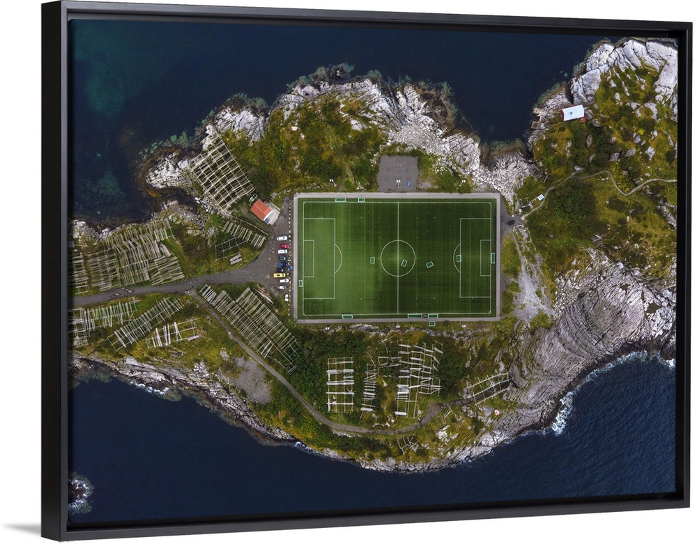<p>The football field of Henningsvaer framed by the rocks of the coast. Lofoten Islands, Norway.</p>