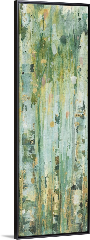 <p>Tall and skinny vertical contemporary abstract painting with lines of green, blue, yellow, and gold hues running vertically on the canvas resembling a forest.</p>