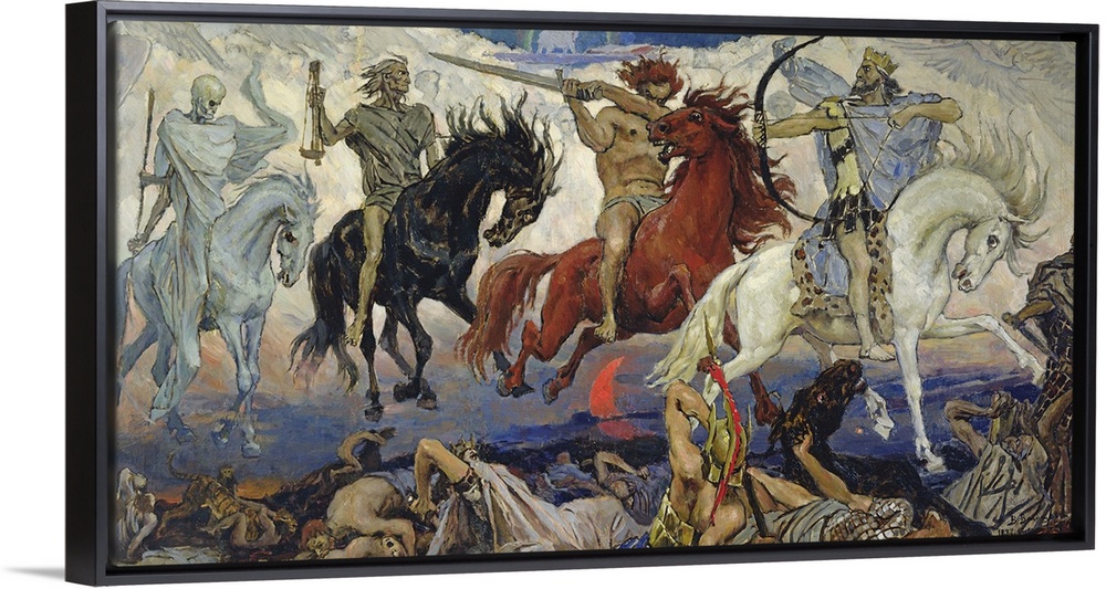 <p>BAL322449 The Four Horsemen of the Apocalypse, 1887 (oil on canvas) by Vasnetsov, Victor Mikhailovich (1848-1926); Museum of Religion and Atheism, St. Petersburg, Russia; (add. info.: The four horsemen of the Apocalypse are Conquest, War, Famine and Death; from the Book of Revelation in the Bible); Russian, out of copyright</p>