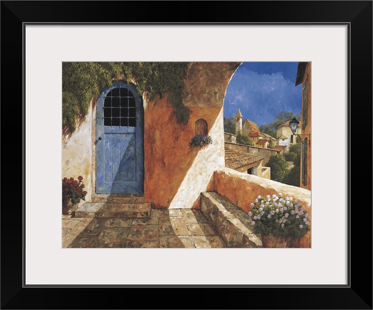 <p>Contemporary artwork of a blue door near an archway in a European village.</p>